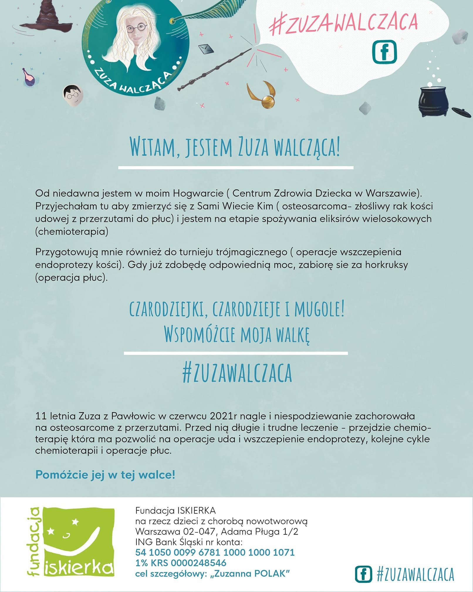 Zuzia jest 11 letnią mieszkanką Pawłowic. W czerwcu 2021r. zachorowała na osteosarcome- złośliwego raka kości. Po kilku tygodniach okazało się, że ma przerzuty na płuca. Zuza jest pacjentką Centrum Zdrowia Dziecka w Warszawie. Więcej informacji na stronie fundacji.Wydarzenie rozpocznie się o godzinie 9:00 w Pawłowicach przy boisku GKS Pniówek. Zawodnicy mają do przebiegnięcia 5 km. Nie ma już możliwości zapisania się na bieg ale cały czas można wspierać Zuzię Polak i jej rodzinę w walce z chorobą. Wpłat można dokonywać na indywidualne subkonto Zuzi lub podzielić się 1% podatku w okresie rozliczeniowym: