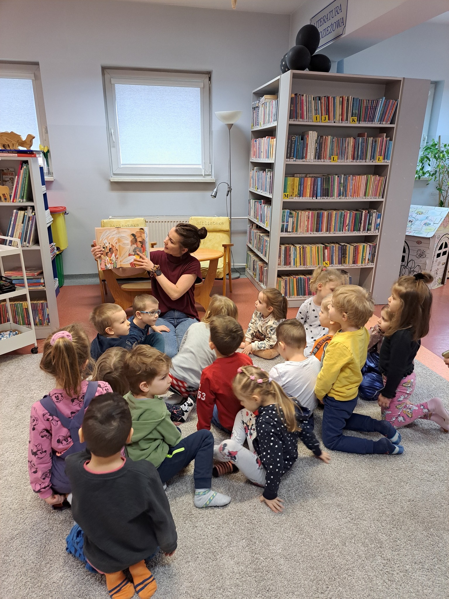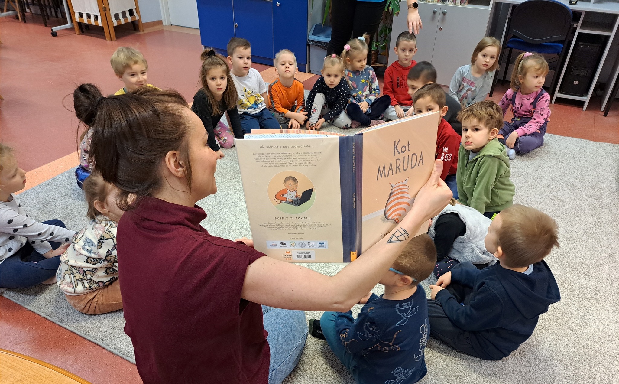 Podczas zajęć dzieci wysłuchały uroczej książki pt. „Kot Maruda”, autorstwa Sophie Blackall, która przypomina nam, że zwierzaki nie są idealne, potrzeba czasu i odpowiedniej uwagi, aby stały się częścią rodziny. Bohater opowieści - Max, to kot ze schroniska, który ma swoje własne, niezależne spojrzenie na świat. Nie bawi się zabawkami, nie mruczy, do czasu aż chłopiec zaczyna czytać mu książkę…