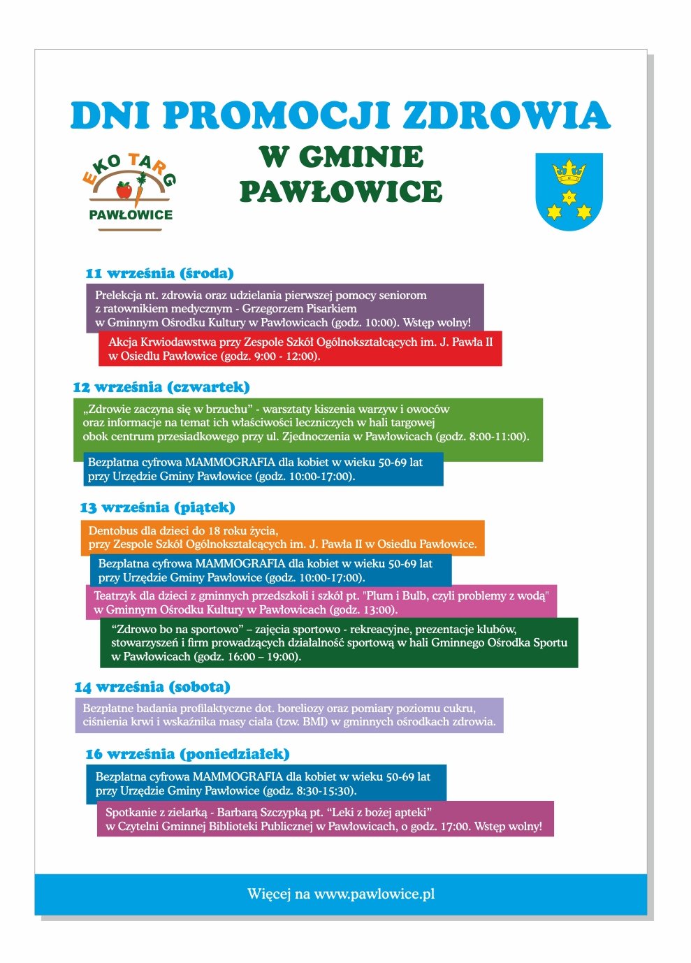 Z kolei w Szkole Podstawowej nr 1 im. Janusza Korczaka w Pawłowicach w ramach gminnych obchodów Dni Promocji Zdrowia, w dniach od 11 do 16 września 2019 r., odbędzie się wystawa plakatów pn. "Jesteśmy tym, co jemy", wykonanych przez uczniów klas siódmych. Uczniowie klas mistrzostwa sportowego stworzą "Żywą piramidę zdrowia" - wieloosobową kompozycję akrobatyczno-edukacyjną, ilustrującą poziomy piramidy zdrowia i jej funkcjonalne znaczenie. Dla uczniów klas IV-VIII zaplanowano prelekcję dotyczącą higieny jamy ustnej z lekarzem dentystą. Każdy uczeń otrzyma także owocowy poczęstunek, tzw. "Witaminowy shot”.