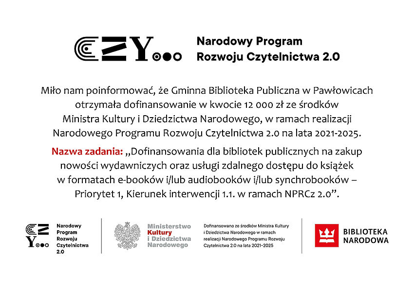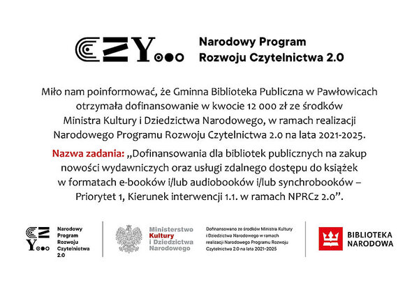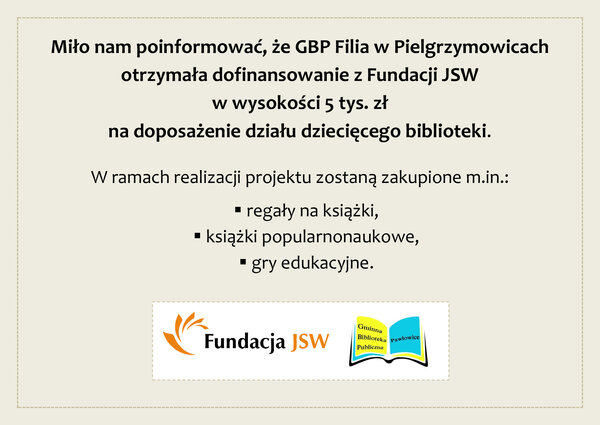 Jednostce udało się pozyskać 12 000 zł ze środków Ministerstwa Kultury i Dziedzictwa Narodowego na zakup nowości wydawniczych oraz usług zdalnego dostępu do książek w formatach e-booków. Dofinansowanie realizowane jest ramach Narodowego Programu Rozwoju Czytelnictwa 2.0 na lata 2021-2025. Ponadto GBP Filia w Pielgrzymowicach otrzymała darowiznę z Fundacji JSW w wysokości 5 tys. zł na doposażenie działu dziecięcego biblioteki. Fundusze te zostaną przeznaczone na zakup m.in. regałów na książki, książek popularnonaukowych, gier edukacyjnych.W galerii plakaty informujące o pozyskanym dofinansowaniu.