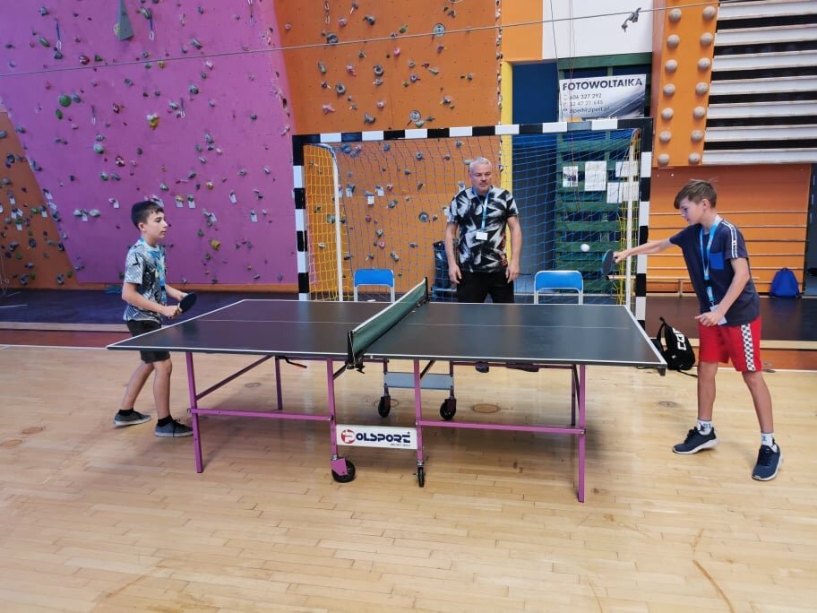 Stół do tenisa stołowego oraz dwóch chłopców grających.