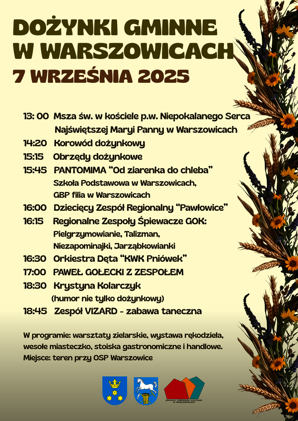 15:45 – PANTOMIMA „Od ziarenka do chleba”(Szkoła Podstawowa w Warszowicach, GBP – filia w Warszowicach)
