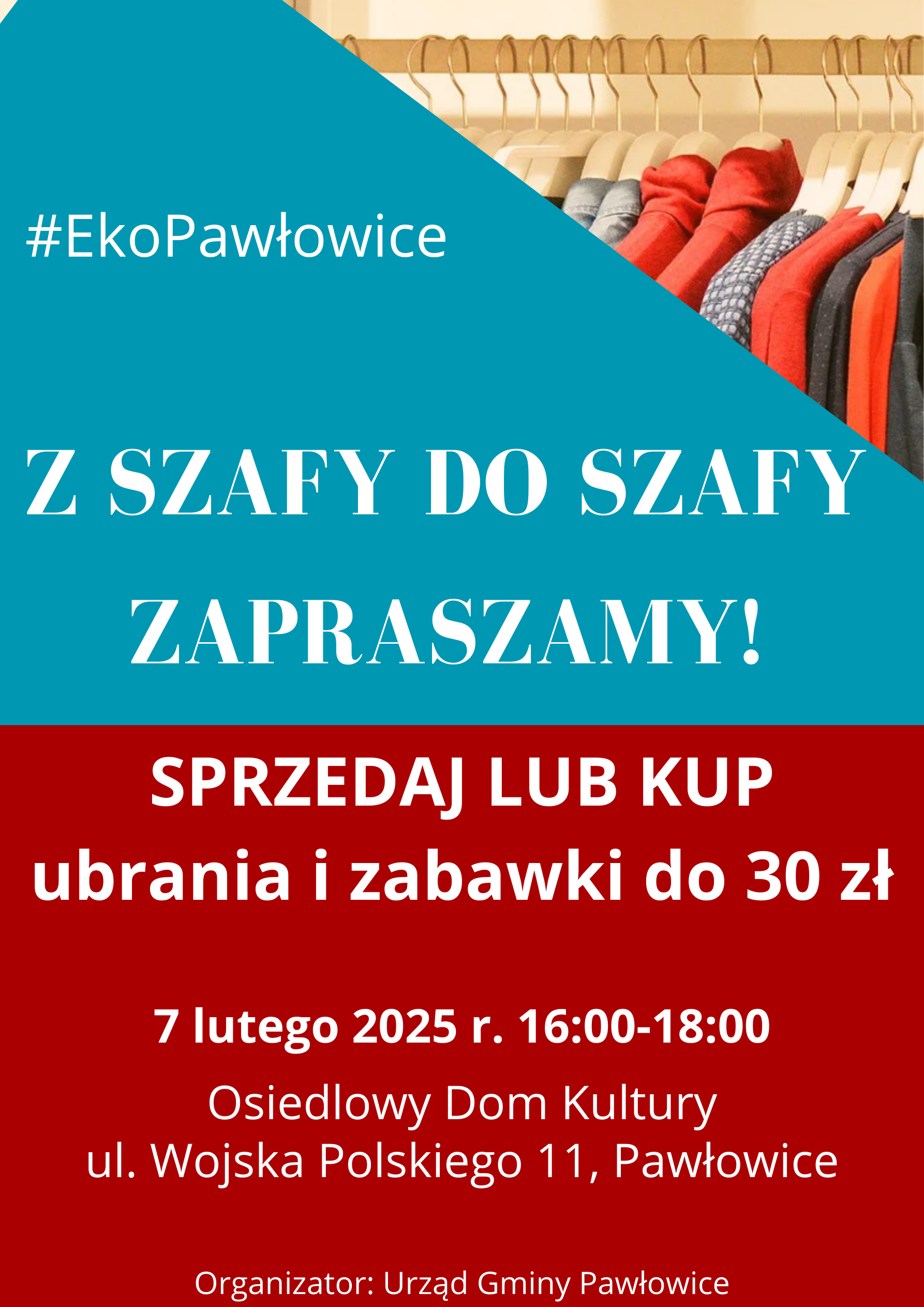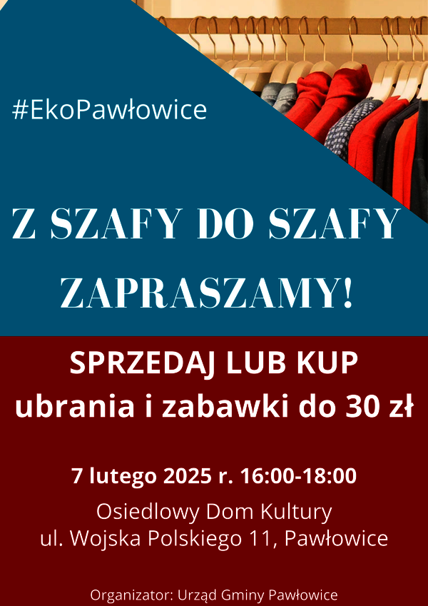 7 lutego 2025 r. zapraszamy na kolejną edycję „Z szafy do szafy”. W pierwszej odsłonie akcji daliśmy drugie życie ubraniom, a przy okazji mogliśmy się poznać i porozmawiać. Jeśli masz w domu ubrania, dodatki lub zabawki, których nie używasz, przyjdż i je sprzedaj.