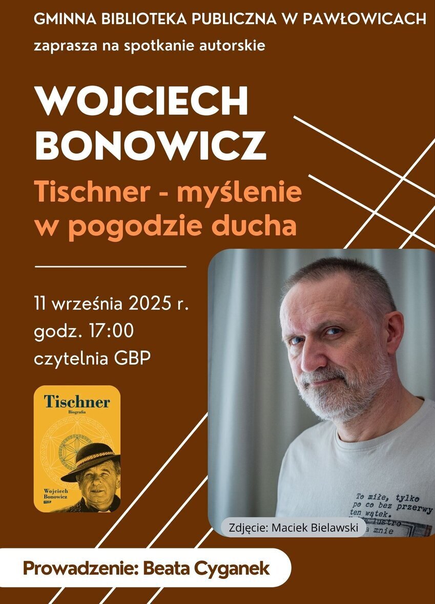 W 2025 roku mija 25 lat od śmierci ks. prof. Józefa Tischnera, wybitnego polskiego filozofa i kapłana. Z tej okazji Gminna Biblioteka Publiczna w Pawłowicach zaprasza na spotkanie z Wojciechem Bonowiczem autorem biografii ks. Tischnera, redaktorem jego książek, zaangażowanym w popularyzowanie życia i dorobku księdza. Wojciech Bonowicz jest również poetą, dziennikarzem i publicystą. Podczas spotkania będzie możliwość zakupienia jego książek, w tym biografii Tischnera, zbioru gawęd o księdzu pt. „Kapelusz na wodzie”, ale również „Dziennika pocieszenia” wydanego w ubiegłym roku zbioru felietonów dotyczących różnych aspektów ludzkiego życia, m.in. podróżowania, braku czasu, roli poezji i nadziei.