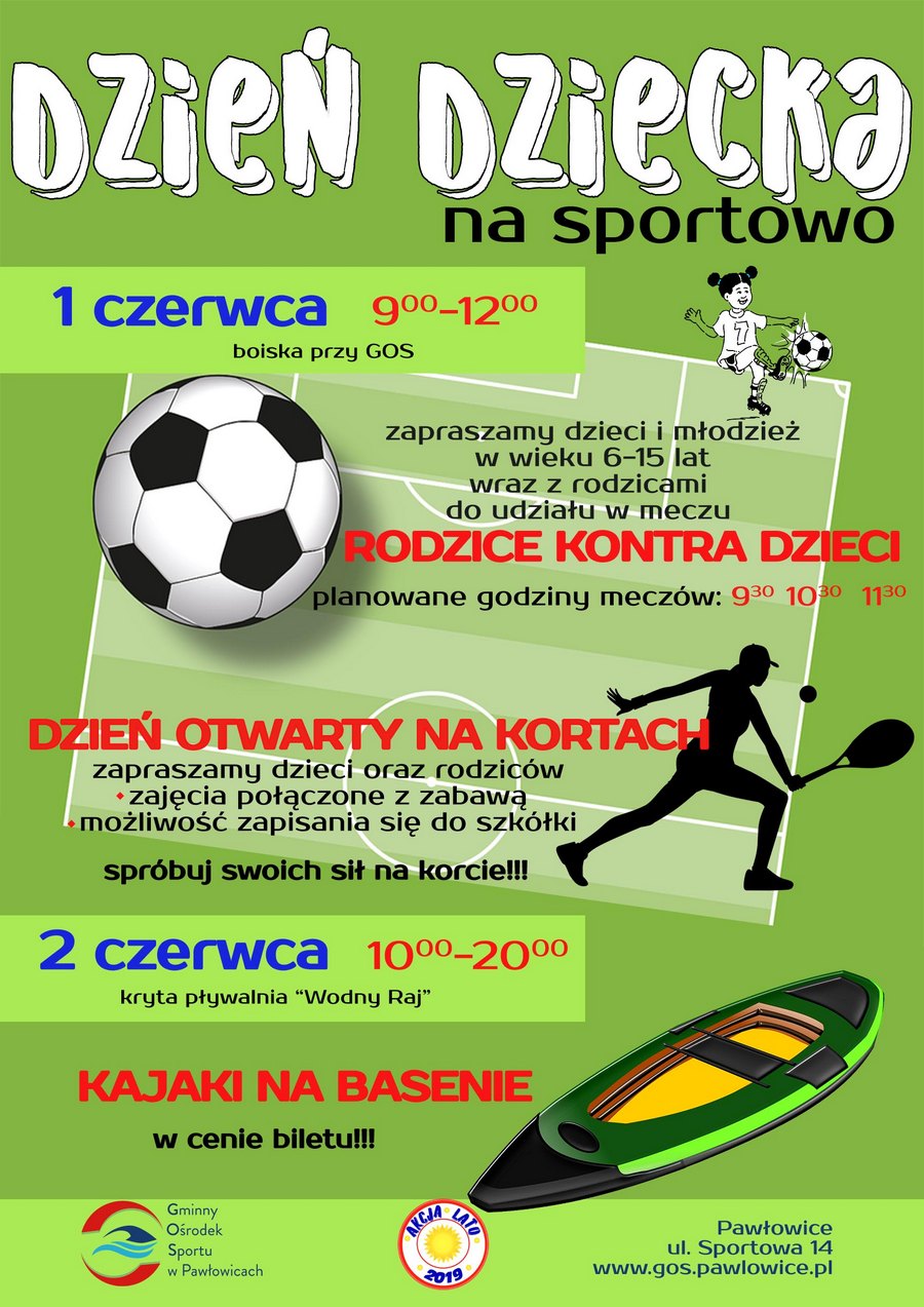 1 czerwca, w sobotę, między godziną 9:00 a 12:00 zorganizowane będą rozgrywki piłkarskie rodzice kontra dzieci. Zapraszamy dzieci i młodzież w wieku 6-15 lat wraz z rodzicami do udziału w meczu. Równocześnie będą prowadzone zajęcia otwarte na kortach tenisowych. Na boiskach przy GOS wykwalifikowani instruktorzy poprowadzą zajęcia z tenisa ziemnego. Warto przyjść i poznać zasady gry.