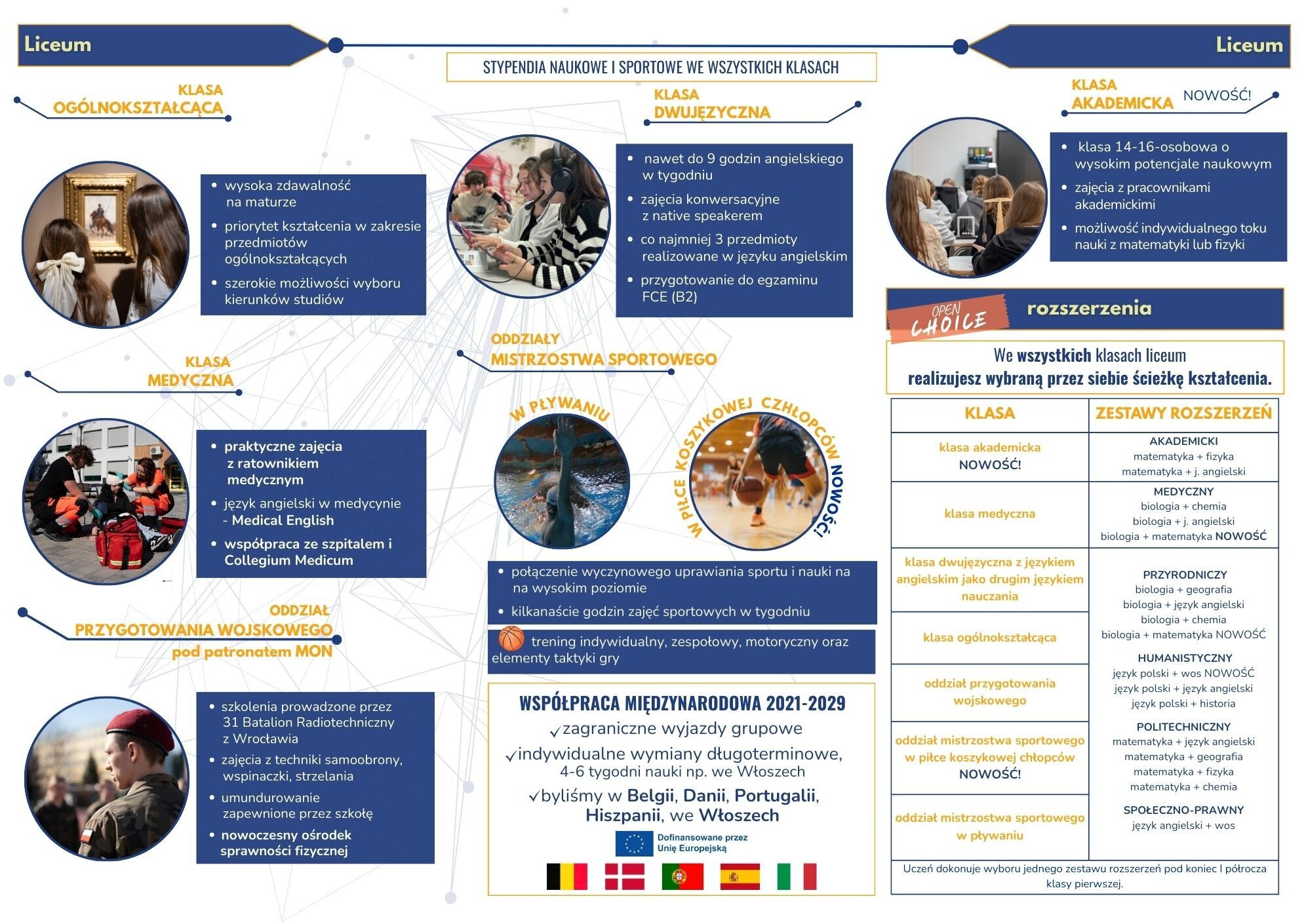 Szkoła realizuje również projekty międzynarodowe (2021–2029), oferując:
