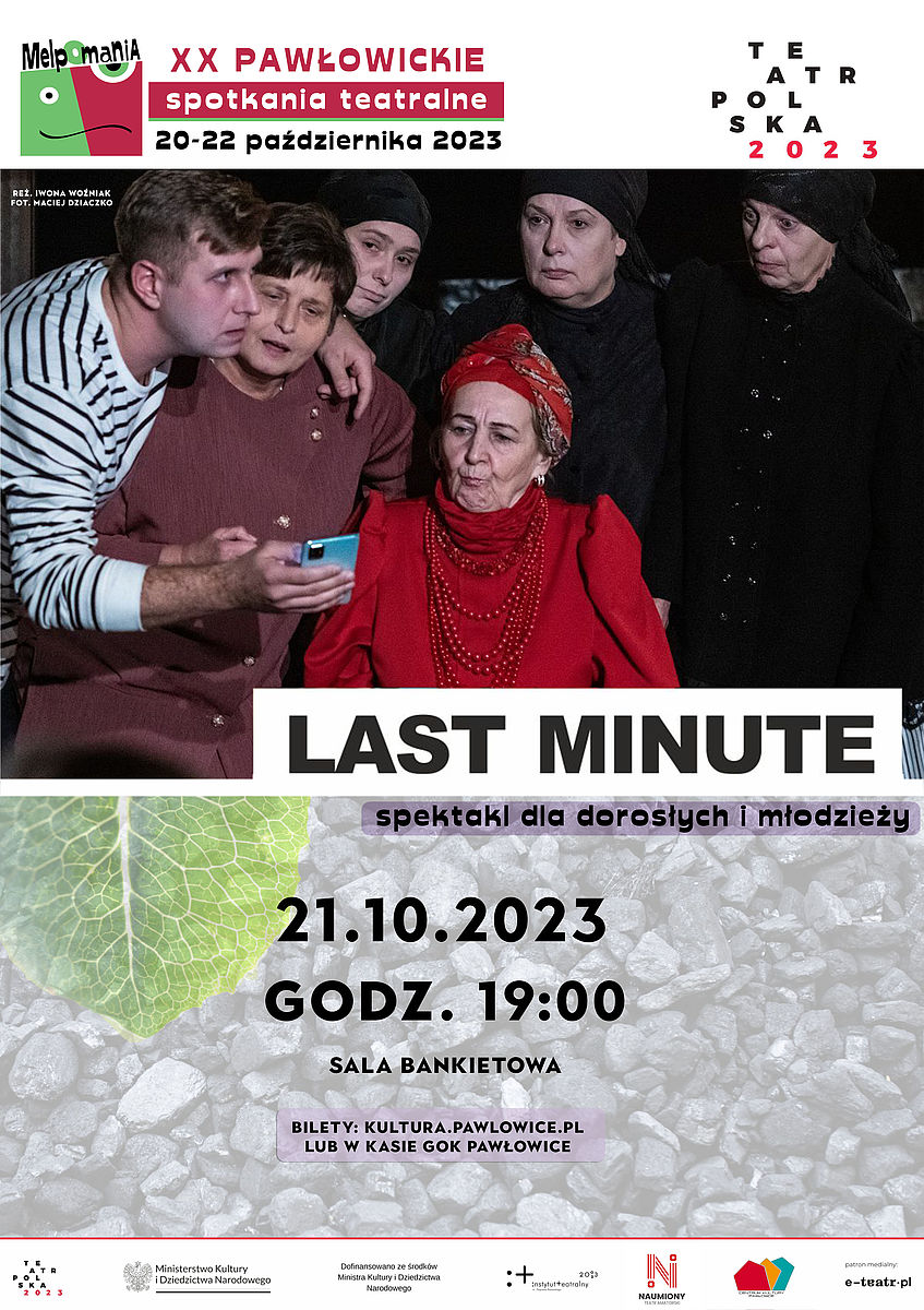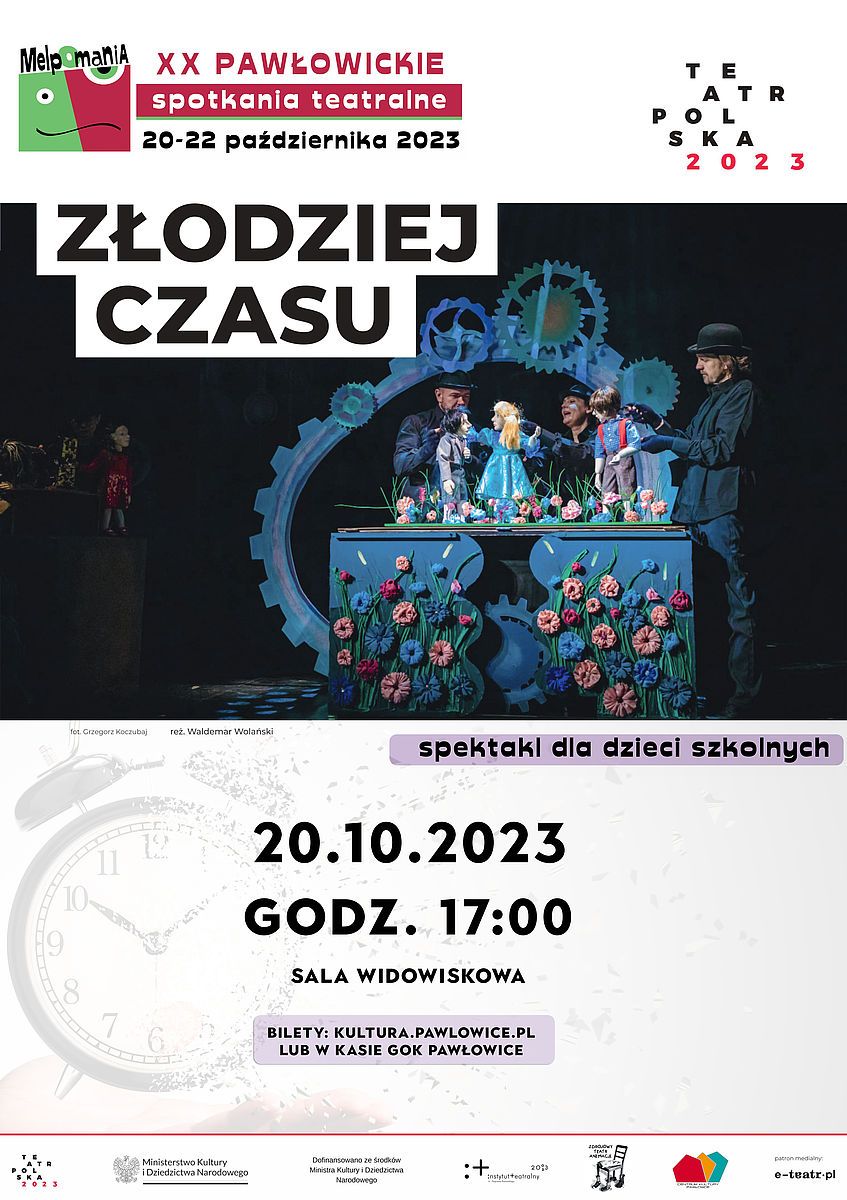 Jubileuszowa XX edycja Melpomanii rozpoczyna się w piątek 20 października i potrwa do niedzieli 22 października 2023 r. Na scenie Gminnego Centrum Kultury w Pawłowicach zobaczymy trzy spektakle, zapewniamy, że każdy znajdzie coś dla siebie! Zapraszamy dzieci, młodzież i dorosłych. Wykorzystajcie szansę na przeżycie trzech dni pełnych teatralnej magii. Bądźcie częścią Melpomanii - rezerwujcie czas i kupujcie bilety. Zapraszamy!  Harmonogram wydarzenia:20.10.2023 r. g. 17:00„Złodziej czasu” reż. Waldemar WolańskiSpektakl dla dzieci od 6 roku życia.Magiczna baśń opowiadająca o walce dobra ze złem, ale przede wszystkim o czasie i jego upływie. Kolorowe postacie, wciągająca fabuła i nauka ważnych wartości. To wszystko czeka na dzieci podczas widowiska.Kup bilet: okp.systembiletowy.pl/index.php/repertoire.html21.10.2023 r. g. 19:00„Last minute” Teatr Naumiony,  reż. Iwona Woźniak  Spektakl dla młodzieży i dorosłych.Głównym bohaterem przedstawienia jest podejmujący pracę na pobliskiej kopalni, młody górnik, który planuje wakacje „last minute”. Wkrótce dowiaduje się jednak, że kopalnia ma lada chwila zostać zamknięta. Spektakl pokazuje jak transformacja Górnego Śląska wpływa na jego mieszkańców.Kup bilet: okp.systembiletowy.pl/system_portal.php/repertoire.html22.10.2023 r. g. 19:00