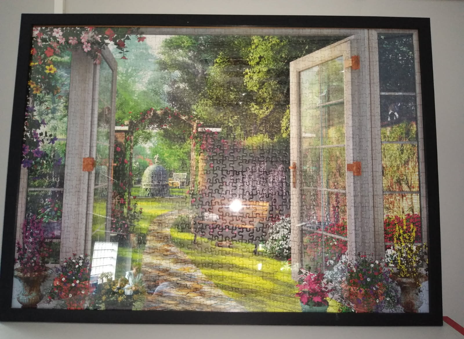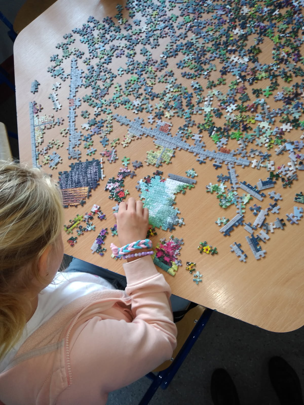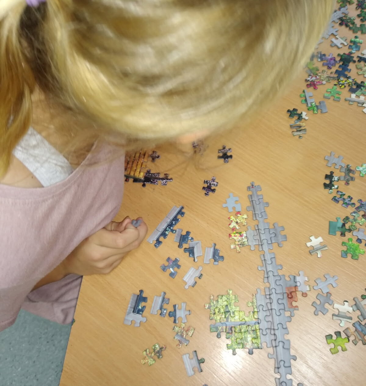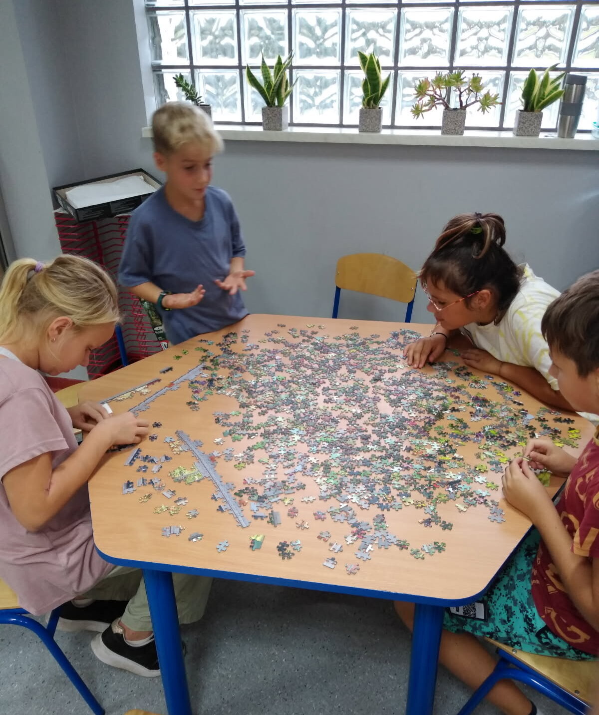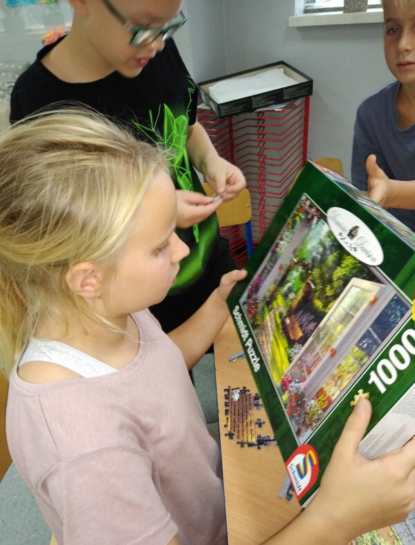 Nie samą nauką i zabawą świetlica żyje. Przez kilka dni dzieci układały puzzle z pięknym obrazem ogrodu, które potem zostały sklejone i oprawione, by dłużej cieszyły oczy nie tylko dzieci i wychowawczyń, się także przychodzących do świetlicy gości.