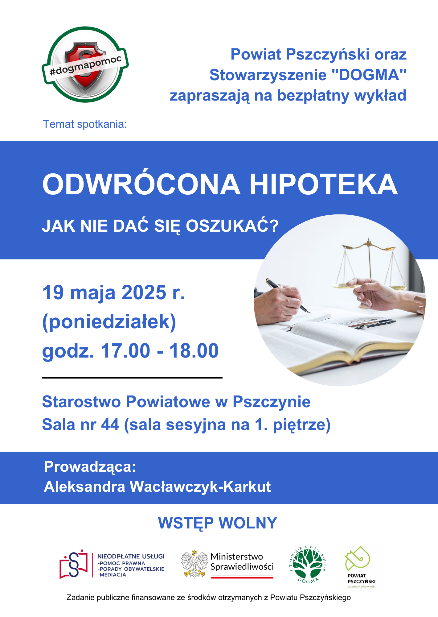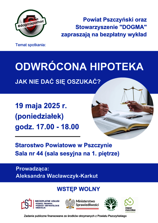 Prawniczka przedstawi mechanizm działania odwróconej hipoteki - jej korzyści, jak i potencjalne zagrożenia. - Edukacja w tym zakresie jest niezwykle istotna. Wykład skierowany jest przede wszystkim do seniorów ale zaproszeni są wszyscy mieszkańcy powiatu pszczyńskiego. Seniorzy często słyszą o odwróconej hipotece jako sposobie na lepszą starość bez konieczności sprzedaży mieszkania. Problem w tym, że teoria brzmi lepiej niż praktyka.