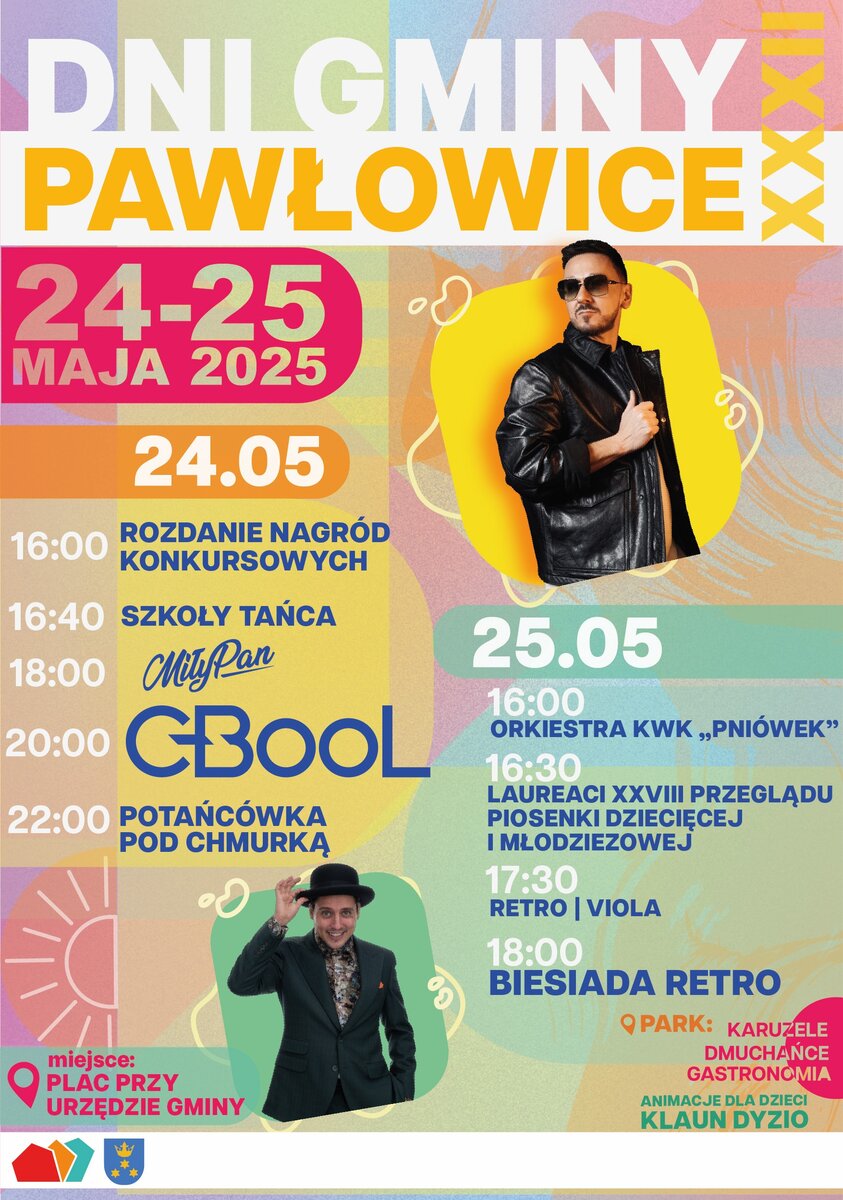 W sobotę 24 maja na scenie przy Urzędzie Gminy Pawłowice pojawi się Miły Pan, znany m.in. z przeboju „Królowa” , który zebrał ponad 161 mln. wyświetleń. W sobotę wystąpi również C-Bool, jeden z najpopularniejszych polskich DJ-ów i producentów muzyki klubowej. Jego największe hity, takie jak "Never Go Away", "Magic Symphony" czy "Wonderland" zdobyły ogromną popularność nie tylko w Polsce, ale i za granicą. Zwieńczeniem wieczoru będzie „Potańcówka pod chmurką”.