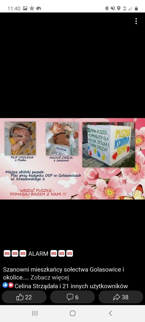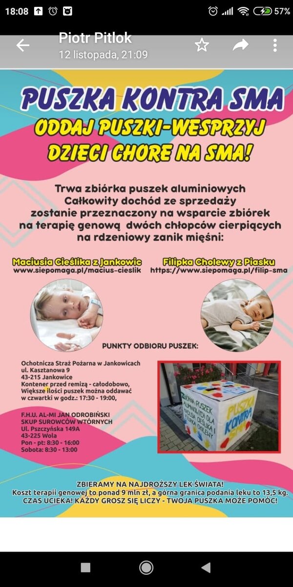 OSP Golasowice włącza się w akcję zbiórki puszek aluminiowych na rzecz dwóch chłopców chorych na Rdzeniowy Zanik Mięśni, w skrócie SMA. Dzieci są mieszkańcami powiatu pszczyńskiego, Maciuś jest z Jankowic (o Misiu dla Maciusia pisaliśmy tutaj), Filipek z Piasku. Całkowity dochód ze sprzedaży puszek zostanie przeznaczony na terapię genową. Zachęcamy nie tylko mieszkańców Golasowic, ale i całej gminy Pawłowice do włączenia się w akcję. Miejscem zbiórki puszek jest plac przy budynku OSP w Golasowicach (ul. Kraszewskiego 2).