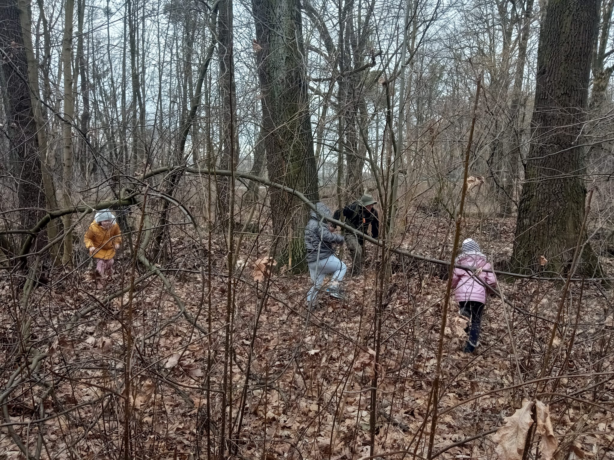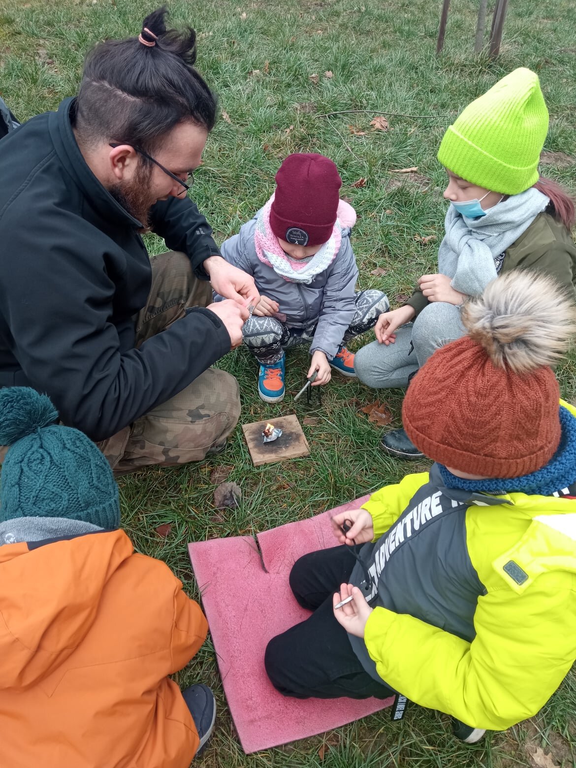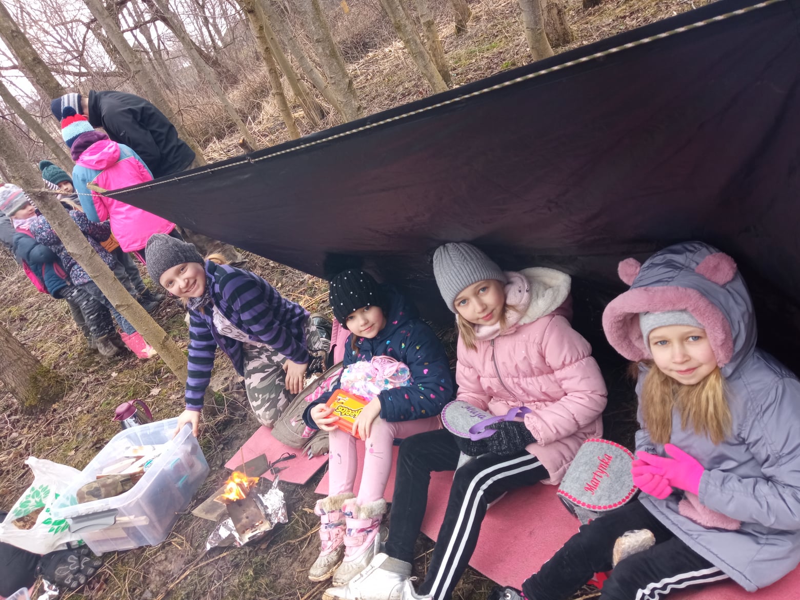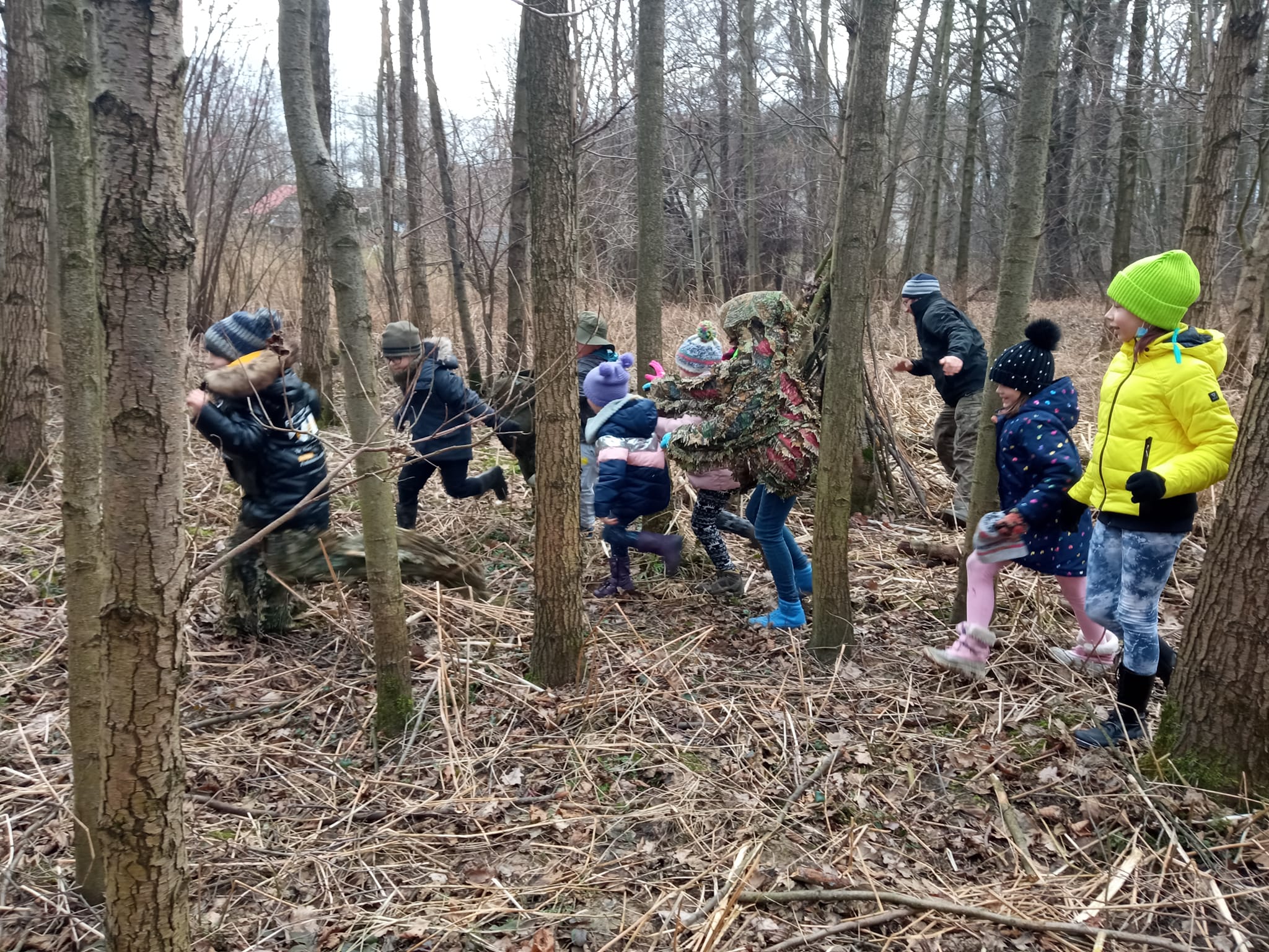Na rozgrzewkę była zabawa w berka, później dzieci budowały szałasy i odbijały zakładnika - plecak z rąk nieprzyjaciela. Nauczyły się rozpoznawać umowne znaki zwiadowcze, maskować w terenie. Podzielone na dwie drużyny: Złośliwe Lisy i Watahę grały w podchody i poznały znaki patrolowe. Po przerwie na poczęstunek nadszedł czas na kodowanie szyfrem czekoladka, zabawę z gumizela oraz rozpalanie ogniska krzesiwem.