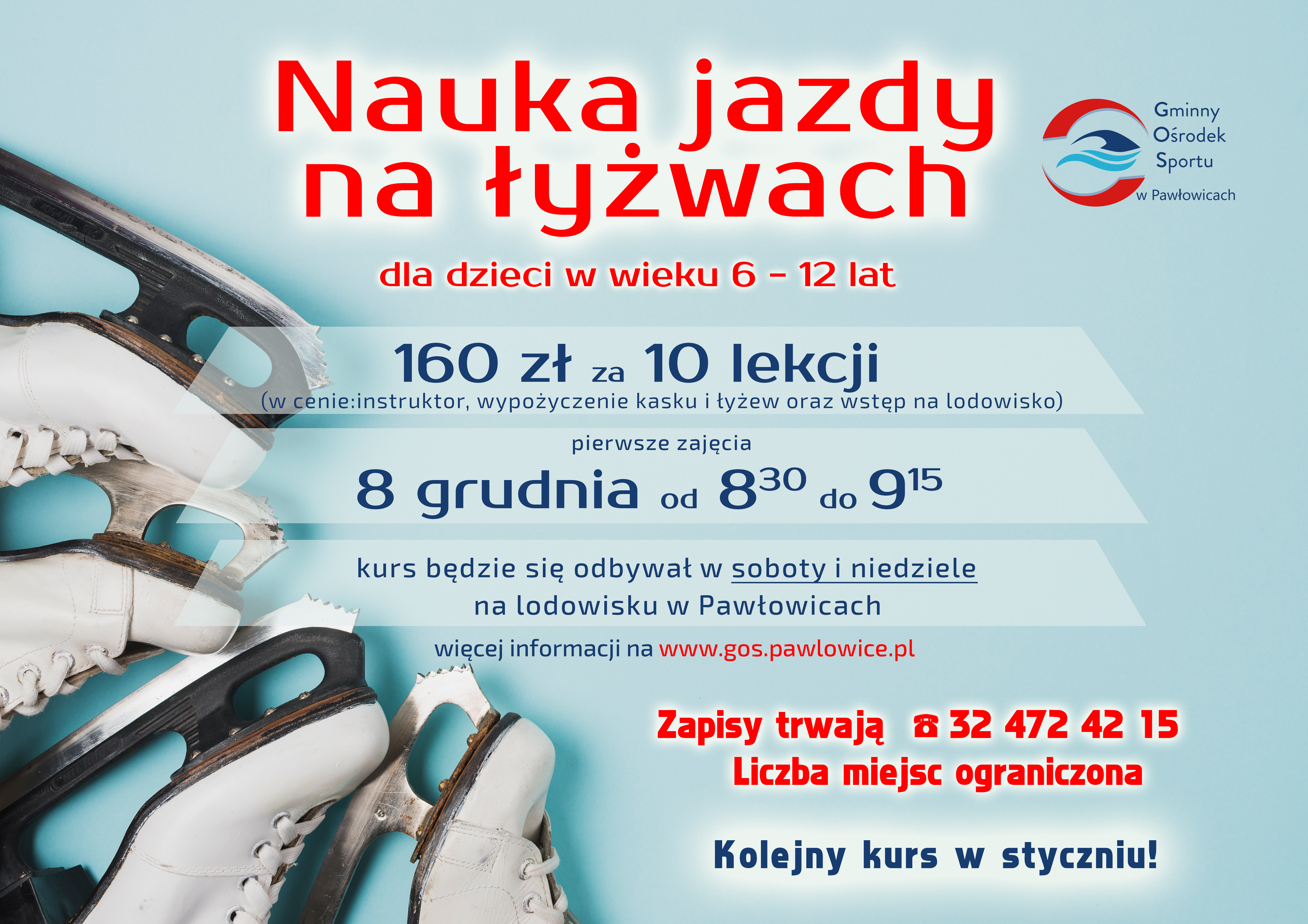 W sobotę, 8 grudnia, na lodowisku w Pawłowicach rozpoczynamy "Naukę jazdy na łyżwach". Nauka przeznaczona jest dla dzieci w wieku 6-12 lat i obejmuje 10 lekcji po 45 minut. Zajęcia będą się odbywać w soboty i niedziele, o godzinie 830.