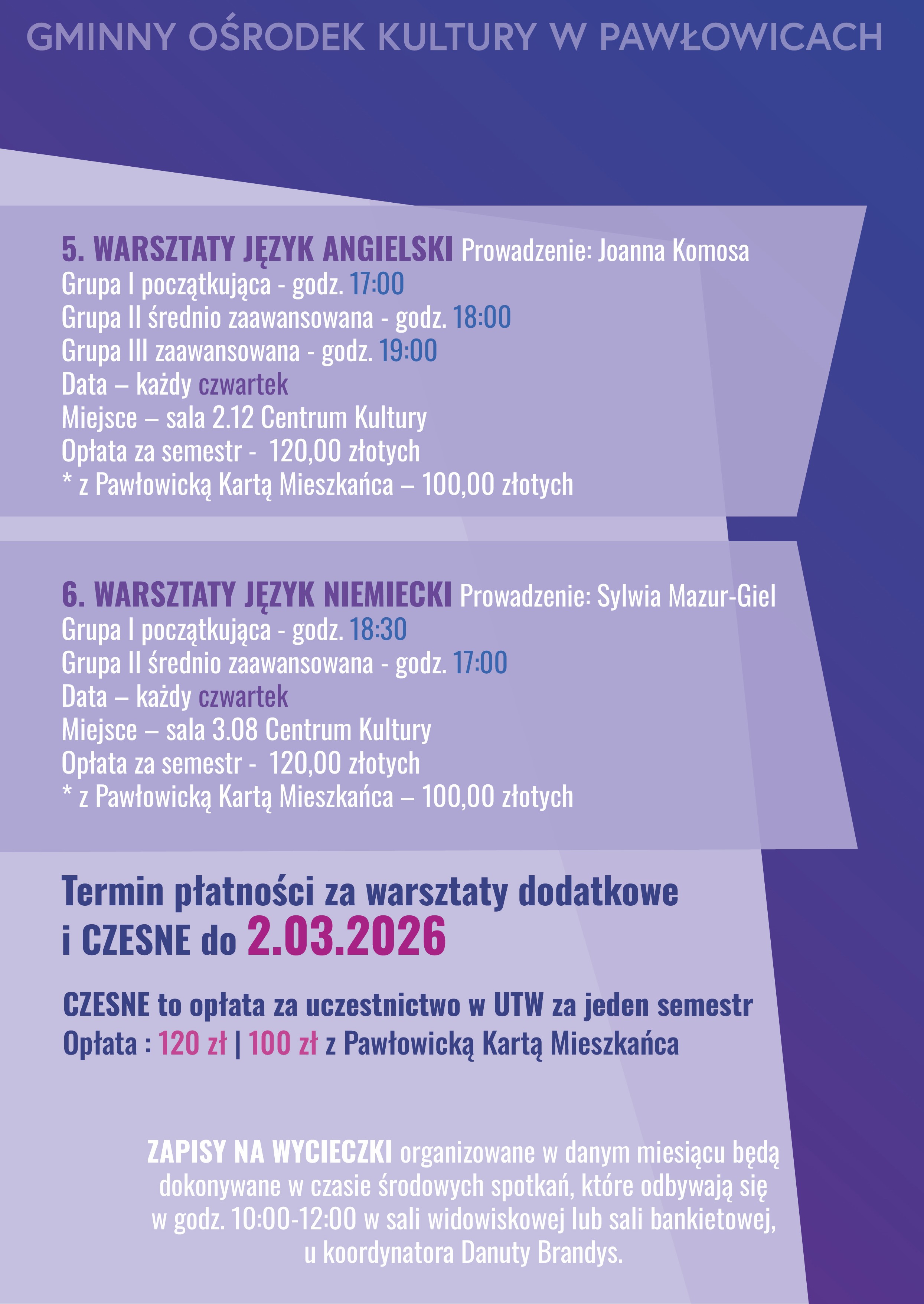 Termin płatności za warsztaty dodatkowe oraz CZESNE na drugi semestr do 02.03.2026 r.